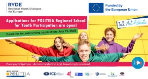 Talk. Act. Activate! POLITEIA 2025 – Regional School for Young People Who Make a Difference! Regional Youth Dialogue for Europe – RYDE Are you ready to change things? Do you want your voice to be heard? Join the POLITEIA Regional School for Youth Participation 2025, taking place from September 21 to 27, 2025, in Belgrade, Serbia! POLITEIA is known as a school ...
